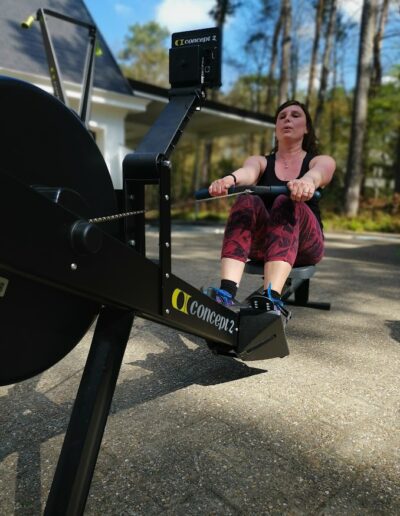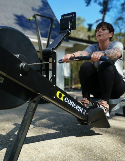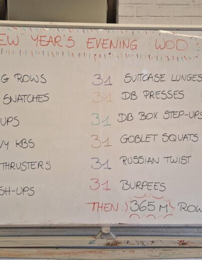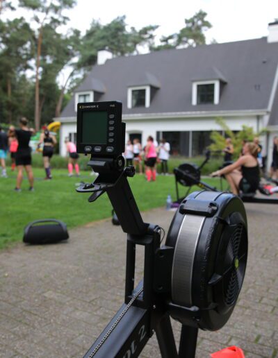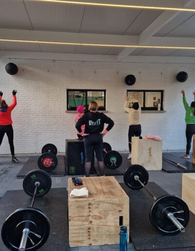 ‘boenk’ muziekske op de achtergrond om ons te motiveren. Een blik van Dorien en we passen onze oefeningen spontaan aan, bij wall sit beetje dieper gaan zitten, beetje harder roeien.. Ze haalt het beste in ons sterke zelf naar boven”